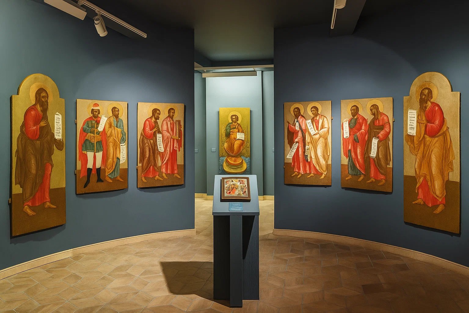 Carefully modulated lighting preserves the delicate surfaces of ancient icons while creating an atmosphere of gentle reverence.